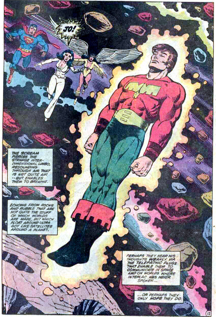When Supergirl arrived from the 21st century, Ultra Boy was no longer the strongest Legionnaire. Karate Kid engineered a faux mission, pairing Jo with Supergirl on a red sun world. Because her powers did not work under a red sun, Jo was forced to send her back and handle the threat himself. The ploy restored Ultra Boy's confidence about his place in the Legion (Supergirl and the Legion #22)