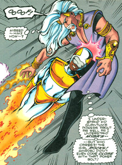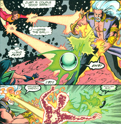 When Mordru threatened the galaxy, all the major groups of teen heroes participated. In this mystical battle, both Atom'x and Blast-Off apparently lost their lives. (Legionnaires #49-50) No one could have guessed that both lads survived these attacks in the form of pure energy. Mordru's magic enabled their souls to inhabit this sentient energy, and the two of them were forever merged into a single entity.