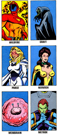Tom and Mary Bierbaum on Wildfire: "He always seemed like the flattest, most two-dimensional character of the lot. But in a way, he was the perfect character to take the role of the inevitable upstart, the loudmouthed newcomer who just doesn't understand or respect the greatness that proceeded him. I liked him a lot more as the traditional hero of his original couple appearances, and he was on his way to being one of my all-time favorites, until they came up with the Marvel-inspired hothead business." —Interlac (2000)