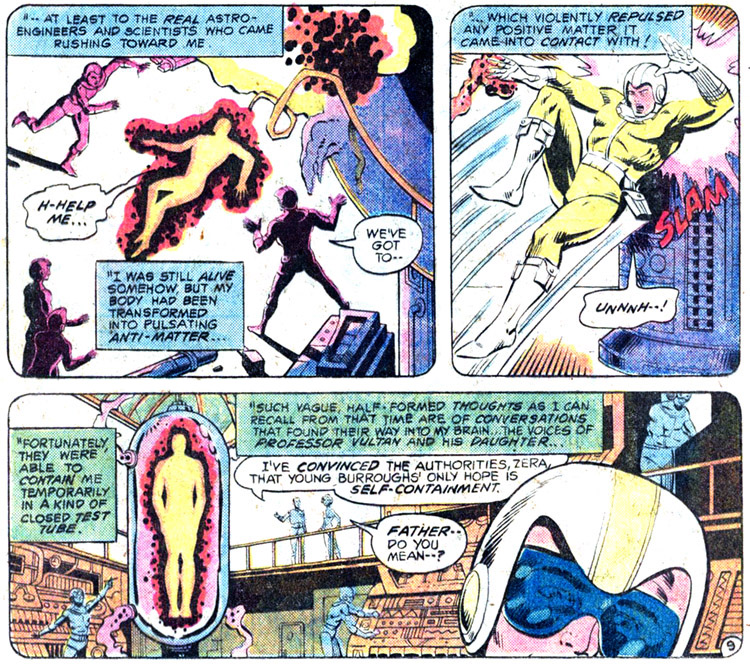 But if he could be said to be lucky to have survived, then he was certainly lucky to be, at that time, in the company of Professor Bothar Vultan, who happened to have a suit made to contain anti-energy. Professor Vultan managed to siphon Drake's energy into the suit, and it gave Drake human form once again. With the help of the Professor and his daughter Zera, he learned how to control his new form, and how to use it to perform superhuman feats, mimicking the abilities of many members of the Legion of Super-Heroes. What he did not learn was why the Professor had such a suit in the first place. (Legion vol. 2 #283)
