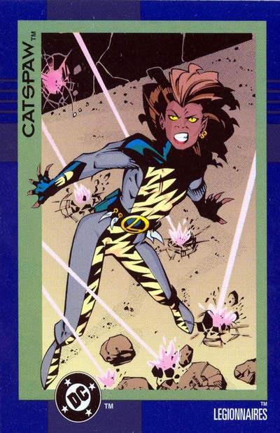 While seeking shelter, they encountered the SW6 Legionnaires, Lightning Lad and Saturn Girl, who took them to their command post. There April got accustomed to her new self and when Reep Daggle decided to help establish the SW6 team on New Earth, he brought April into the group. He gave her the super-hero code name of Catspaw. (#41) Daggle noted that she was "charmingly naive and self-accepting, in a possibly bestial way. Seems on the sexually aggressive side." (2995: Legion Sourcebook) Indeed, Catspaw seemed content to chase the boy Legionnaires like mice.