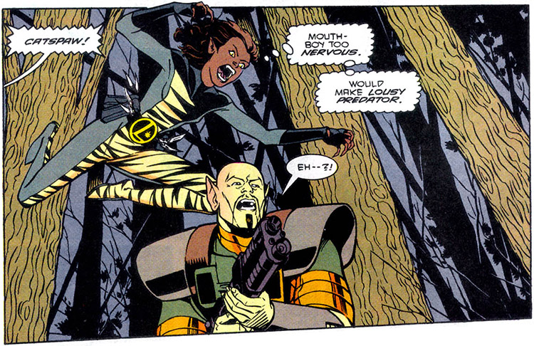 "At one point he and we were trying to work out a 'Legionnaires' fill-in that would have given more of her background, but we didn't start thinking about that possibility until our time there was almost up. Basically, Catspaw was just a woman on Earth when the Dominators were secretly nabbing people and experimenting on them. There was a boyfriend character (from the Legionnaires story where they meet all the Protys on Antares, I think his name was Ansis) who was supposed to have somehow betrayed her and been the cause of her being kidnapped by Earthgov/Dominators."