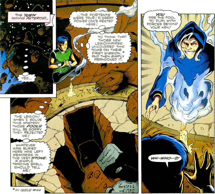 He discovered magical power emanating from a recently-vacated crypt on the planetoid Yuen, but before he could tap into it, he was caught by the witch Mysa. She knew of the crypt's former prisoner, the sorcerer Mordru. (#46) Xao went to try and warn the Legion about Mordru's coming, but they ignored him because of his hysterics; he left with a contempt for the disbelievers. (#47) Jin returned to Mysa to help her prepare to fight Mordru (#48), and both of them ultimately joined forces with the Legion. (#49)