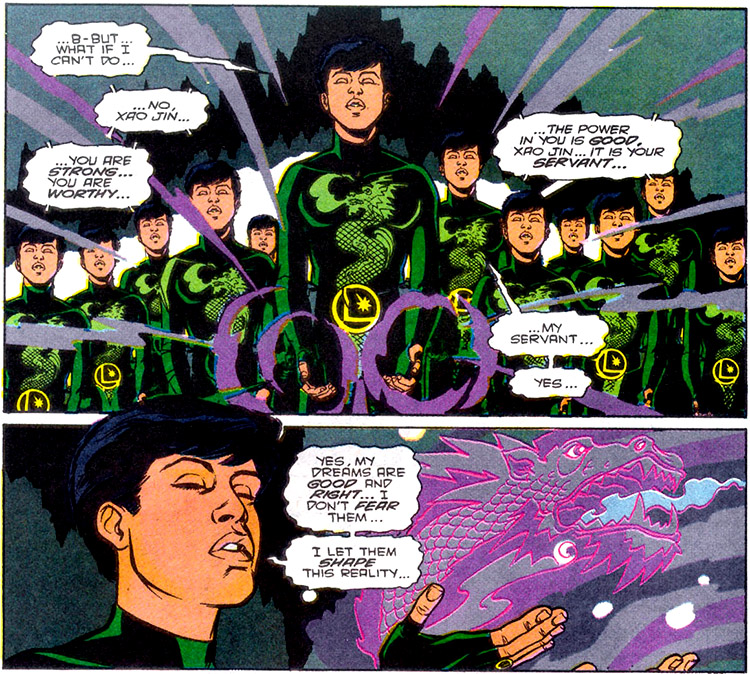 His spells, which usually manifested with dragon-shaped holograms, proved useful while the four were on the run. But he was not completely trained in the use of his power, and was easily rattled. Nonetheless, he was inducted into the New Earth team of Legionnaires upon its formation, (Legionnaires #1) where he worked to master his concentration and skills. (Legion vol. 4 #41)