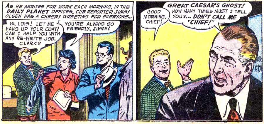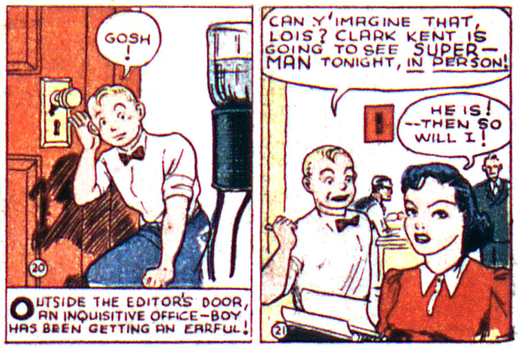As an office boy, then cub reporter at the Daily Planet, Jimmy was privy to much of the goings-on between Lois Lane and Superman, and their wild adventures. (Action Comics #6, Superman vol. 1 #13)
