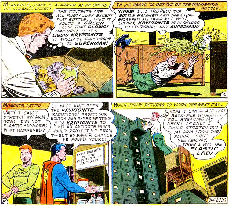 Prof. Potter reappeared many times, but he was not the original source of Jimmy's most well-known alter ego, Elastic Lad. Jimmy gained the ability to stretch and reshape his body from an alien chemical brought to Earth by Superman. He sought a cure from Professor Bolton, who blackmailed Jimmy into performing super-feats against his pal. After Superman caught Bolton, Jimmy was "cured" of these powers. (Superman's Pal, Jimmy Olsen #31)