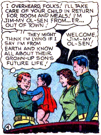 Jimmy Olsen's first encounter with Superman happened when Olsen responded to an ad in the newspaper calling for a volunteer to take a "trial flight of a new ship!" The ship turned out to be a time ship invented by one Professor Crane. Crane sent Jimmy 20 years into the past — to Krypton! Olsen met Jor-El and Lara, and baby Kal-El. This was just before Krypton was self-destructing and Jimmy actually helped the Els prepare Kal for his journey to Earth.