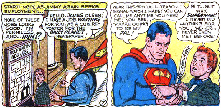 But when Jimmy recrossed the time barrier, his memories of this trip were erased. Crane believed that his invention had been a failure. Not long after this, Superman noticed Jimmy searching for a job and offered him a position at the Daily Planet. The hero also instructed him, "wear this special ultrasonic signal-watch ... you're going to be my pal!" (The watch was an invention from the Adventures of Superman television series.) (Superman's Pal, Jimmy Olsen #36)