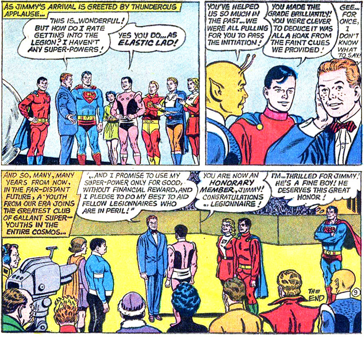 Jimmy Olsen first encountered beings from the 30th century when he became mixed up in a time-travel plot devised by the Legion of Super-Villains. Supergirl helped him defeat them. (#63) The next Legionnaire he met was Element Lad, who came to the 20th century to help Jimmy celebrate the 25th anniversary of Superman's arrival in Metropolis. (#70) Jimmy Olsen finally visited the 30th century for himself, after the Legion of Super-Heroes tested him, then they awarded Elastic Lad with honorary membership in the Legion. (#72)