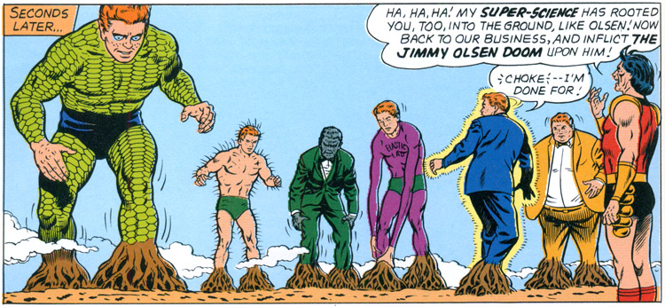 Being relatively close to Superman's unpredictable life, Olsen very often found himself in the middle of a crisis. In many tales, he even gained super-powers and took heroic aliases. A pivotal moment in Jimmy's fate came when Professor Potter visited the Daily Planet offices to demonstrate a new technology. He applied his "z-rays" to Olsen and transformed the young man into an evolved human, with a big "cosmic brain of the future!" Future-Jimmy quickly became a menace, and Potter destroyed his invention. (Superman's Pal, Jimmy Olsen #22)