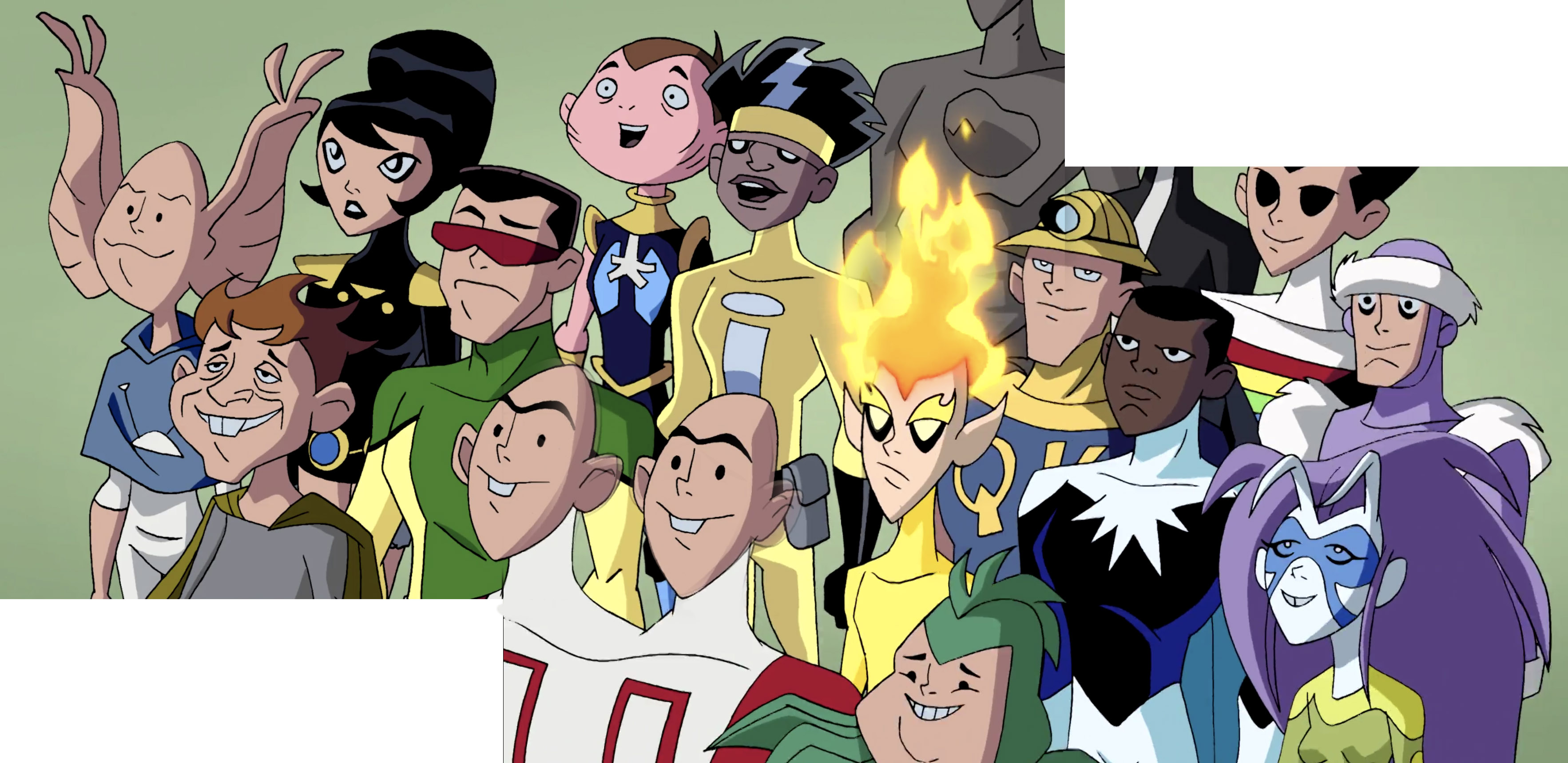 Many familiar comics heroes appear in the cartoon during the Legion membership tryouts. (Star Boy and Matter-Eater Lad are admitted.) From Legion season 1, episode 9