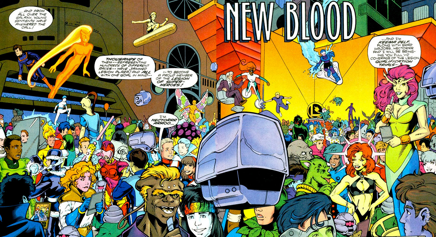 When half of the Legion disappears into the past, new member tryouts are held. From Legionnaires #43 (1996); art by Jeff Moy and W.C. Carani.