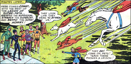 From Adventure Comics #315 (1963); art by John Forte.The Subs travel back in time and cross over to a parallel Earth, where they meet the Inferior Five. From The Brave and the Bold vol. 3 #35 (2007); art by Jesus Saiz.Subs v. Super Pets—too close to call. From Adventure Comics #351 (1966); art by Curt Swan. When Star Boy and Dream Girl are expelled from the Legion, they find a new home with the Subs. From Adventure Comics #342 (1966); art by Curt Swan and Sheldon Moldoff.