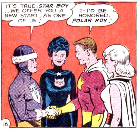 On the day that they all applied for Legion membership, Polar Boy had waited all night and was first up. Ironically, his cold powers were rejected by Sun Boy, but Brek was given an anti-gravity flight-belt as a consolation prize. Later, while walking the Avenue of the Super-Heroes, he was approached by Night Girl, who recognized him from earlier. Together their passion inspired them to form their own group, "to act as a substitute Legion."