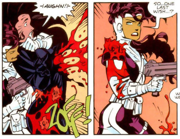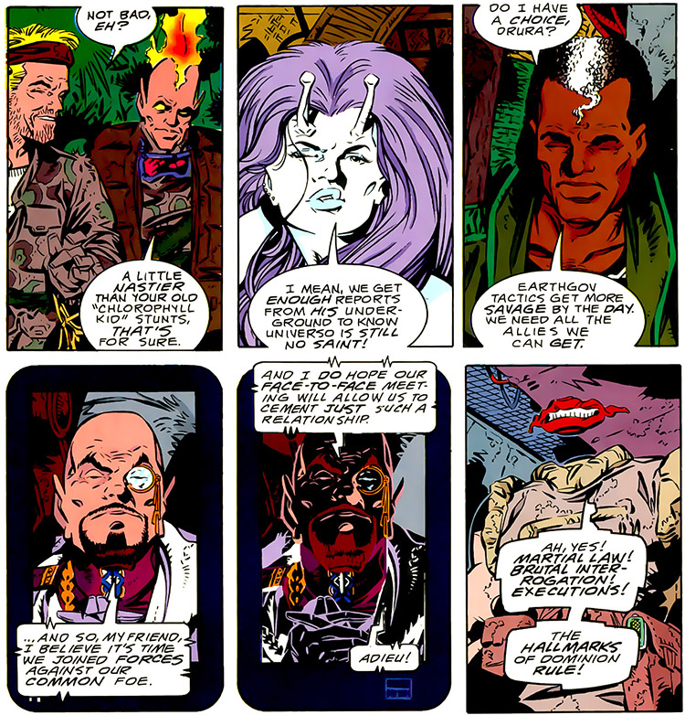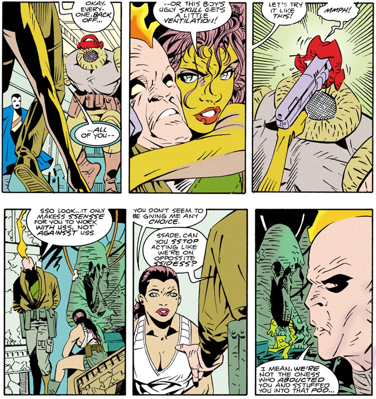 After Monica Sade is liberated from the Dominators, her first instinct is to attack Grinn. Later, Staq fills her in about their operations. From Legion of Super-Heroes vol. 4 #29 (1992); art by Jason Pearson and Al Gordon.