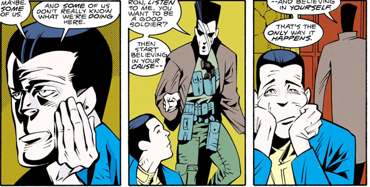 Ulu Vakk tries to encourage the repentant Ron-Karr. From Legion of Super-Heroes vol. 4 #30 (1992); art byJason Pearson and Karl Story.