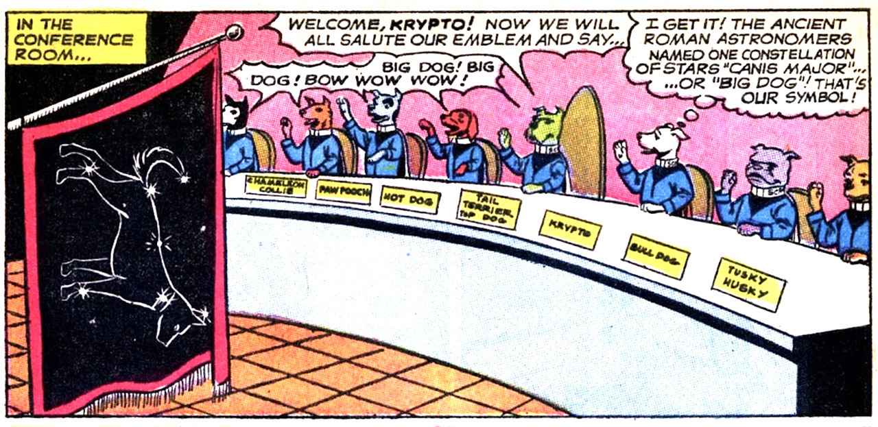 Several years after the creation of the Super-Pets, Krypto the super-dog formed his own Legion-like group in the 20th century. This group of all dogs was called the Space Canine Patrol Agents (Superboy vol. 1 #131, July 1966).