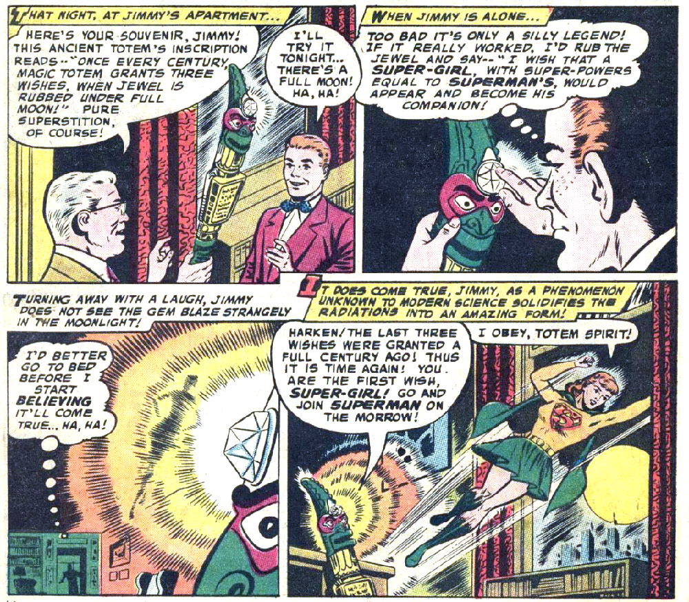 - Super-Girl from Superman #123 (Aug. 1958) was a magical construct who wore a costume identical to the one later worn by Kara Zor-El.