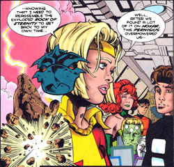 Cece wasted no time taking up her quest to collect all the Eternium fragments. By that time, the Eternium had come to the attention of a Rimborian landlord called Lord Pernisius. With one touch, Pernisius discovered that the rocks gave hime great temporary powers. (Legion vol. 4 #113) Naturally, Thunder's path crossed with Pernisius' in this pursuit, on Rimbor. She also found that while the Eternium might empower others, it was like kryptonite to her. She and Sensor were captured by him and in a stupor, she uttered the name which gave her power: "Captain Marvel." To her surprise, Thunder found herself back at home in the 90th century! The only drawback was that she was without her powers. Her family was elated by the reunion but Thunder knew she must return to the 30th century to rescue Sensor. (#116)