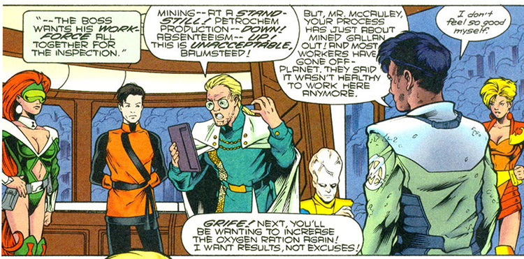 When his rival, R.J. Brande formed the Legion of Super-Heroes, Leland McCauley formed his own group of lackeys to protect his own interests the Workforce. Like the Uncanny Amazers, the Workforce has lost its share of members to the Legion itself. This began in reverse, when Live Wire was ousted from the Legion and joined the Workforce. (Legion vol. 4 #64) Soon thereafter, the Workforce trailed a band of arms thieves, which led them to Planet Hell and the Legion's struggle to save the prison asteroid. (#65, Legionnaires #21-22) A growing romance between Ultra Boy and Apparition was tested when she accompanied the Workforce on a mission (which ended in Live Wire's resignation). (Legionnaires #26) When Apparition was believed dead, Ultra Boy left too. (Legion vol. 4 #76)