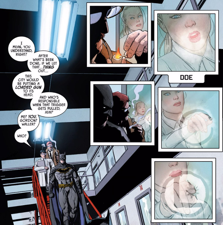 Batman takes no notice of Jane Doe, aka Saturn Girl. From Batman #9 (2016); art by Mikel Janin.