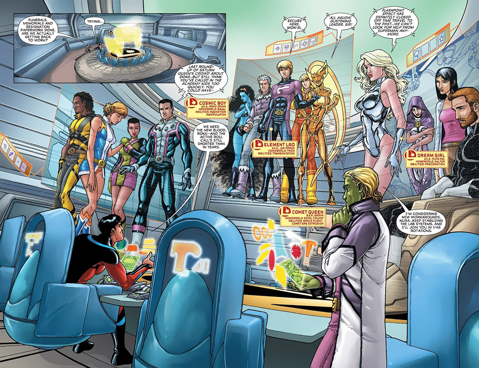 After the title's cancellation, the Legion was cast into limbo again. The team continued to appear here and there, but in wildly different incarnations. For these reasons, the Legion New 52 section of Cosmic Teams does not attempt to establish a linear timeline. Instead simply documents key appearances from Legion vol. 6, vol. 7 and thereafter.