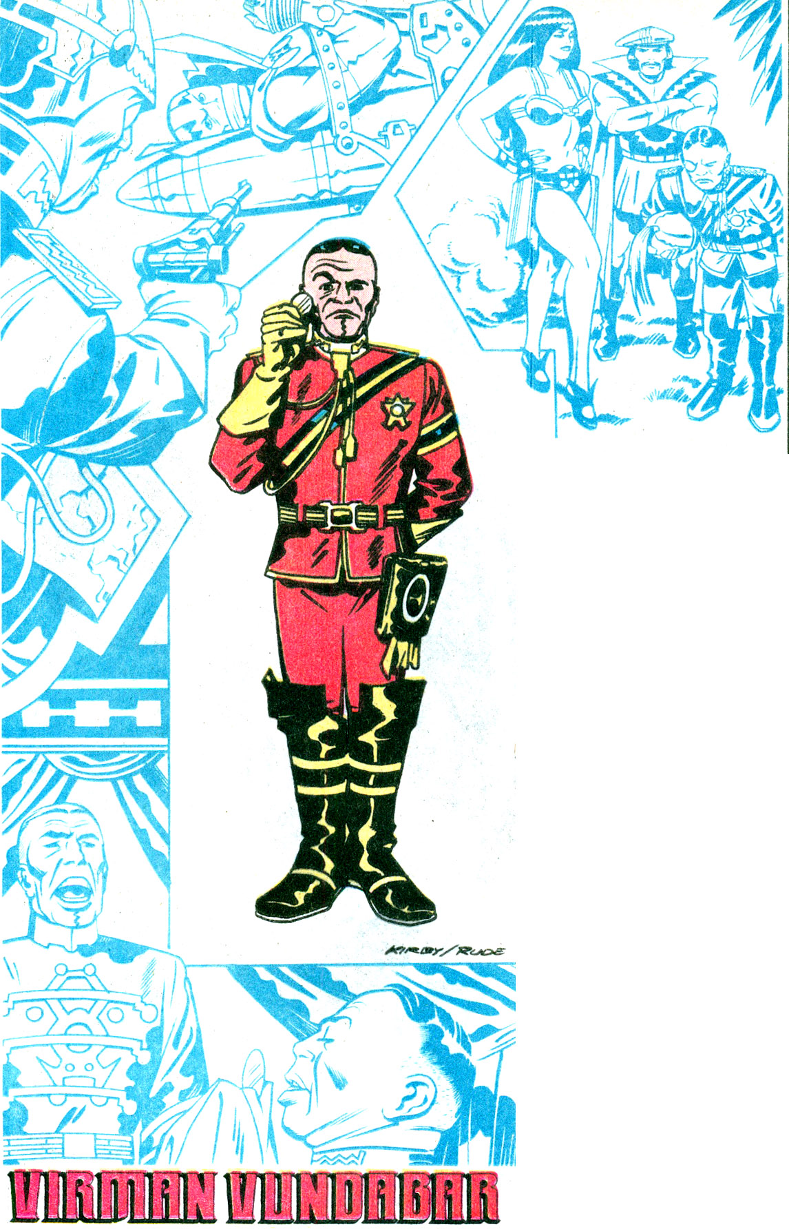Virman Vundabar (Mister Miracle vol. 1 #5). Member of Darkseid's elite. Brother of Malice Vundabar. Destroyed for his treachery by Darkseid's Omega Beams. (Jack Kirby's Fourth World #19) Name sometimes spelled "Vunderbar." Appearances: