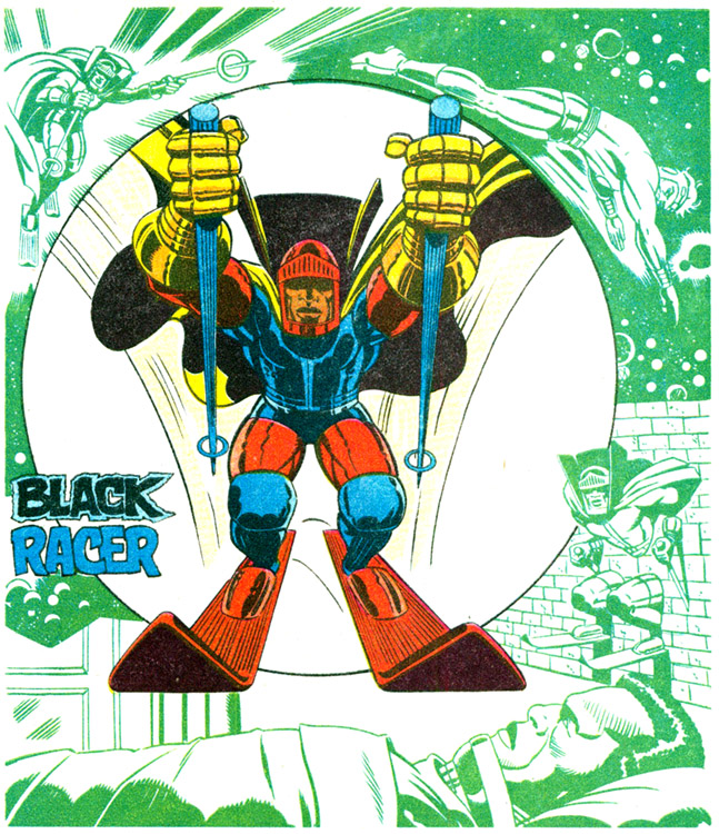 Black Racer (New Gods vol. 1 #3). The New Gods' Grim Reaper, who collects souls and returns them to the Source. Darkseid and Metron created a faux Black Racer ("simulacrum") to stop Orion, whose armor was donned by Scott Free. (Orion #14-15). Appearances: