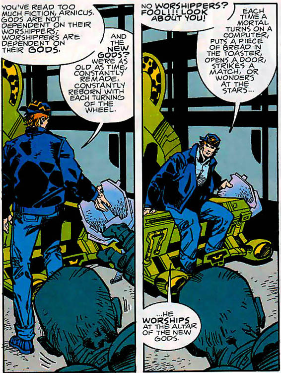 "We never said the New Gods are gods. They've just started to call themselves that becasue that's how the humans refer to them. Nowhere in any of our issues (or Jack's) is there an implication that they are in any way a theological God."