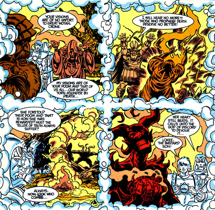 In continuity defined by John Byrne, the Old Gods equated with the "Second World." They were created by the Source (the First World) about 17 billion years ago. Two billion years later, this humanoid life attained "godhood," the Second World. Five billion years ago, the final conflict between factions of the Old Gods was so terrible that it destroyed their very existence. This conflagration was called Ragnarok and it generated a "Godwave" that began sweeping across the universe. When the Godwave passed Earth 40,000 years ago, it sowed the seeds for Earth's own gods (the Third World). Byrne also used Thor. (Jack Kirby's Fourth World #1-4)