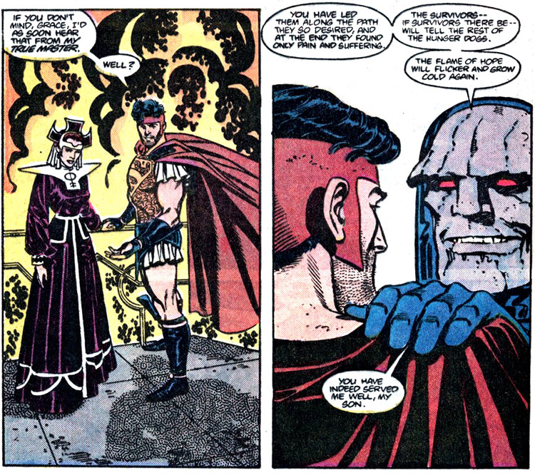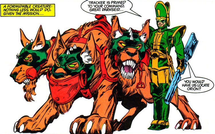 Orion appeared among the Dreggs, where a strange masked figure told him a legend of Wotan, an oracle, and Lokee, who threw the Third World into final chaos. (#7) Lightray found him there and he too saw visions: of Darkseid with his first wife, Suli; of his mother Heggra ordering Desaad to kill her after Kalibak was born; of Darkseid left mistrustful and bitter. Back in Armagetto, Orion and Lightray met a rebel band of Hunger Dogs led by Jovita. Darkseid had sent Tyrus after them with his three-headed hound, Tracker. (#8)