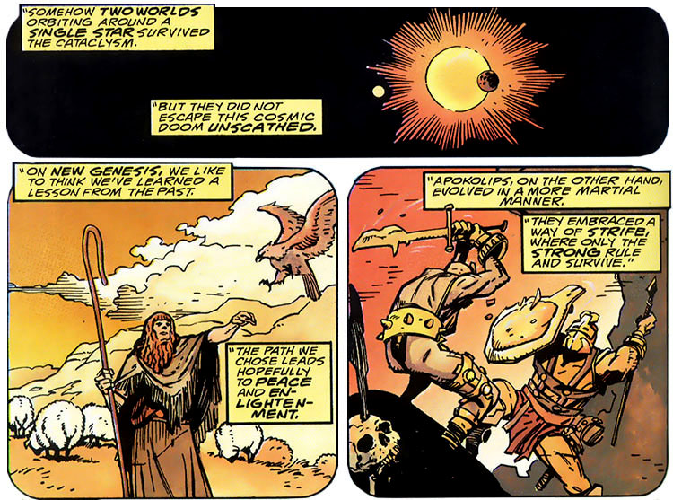 Their Utopian empire spanned a dozen star systems and hundreds of planets. When they encountered a non-human race, their hubris led to a great war. Over centuries this race discovered the Anti-Life Equation, and built technology to access its power. When the scientists attempted to use it, their own planet was destroyed and a dark force — the Anti-Life Entity — was unleashed. The Entity swept across the galaxy, consuming it and expanding until it unexpectedly began to contract. The force of this contraction destroyed a 200-square-light-year area of space. This was the destruction of the Old Gods. Two surviving worlds in one system evolved into New Genesis and Apokolips. They eventually learned that the Anti-Life explosion had walled them off from the rest of the universe. Only centuries later did they develop the means to travel outside of it, by combining the technologies of the Mother Box and the Boom Tube.