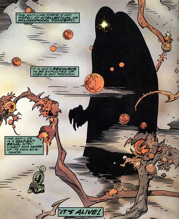 Metron's curiosity led him to discover the existence of this Anti-Life Entity, which he unwittingly unleashed into the universe anew. Darkseid found Metron catatonic and learned about the Entity as well. (Cosmic Odyssey #1)