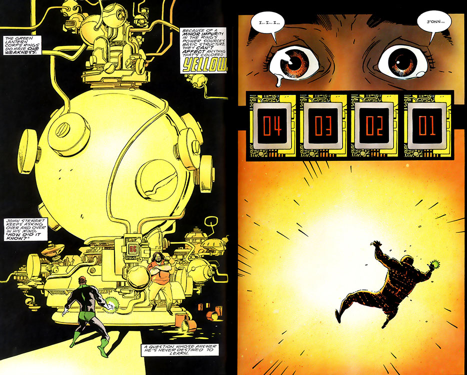 Green Lantern and Martian Manhunter went to Xanshi, where the Aspect had taken over the weather control system. John Stewart was overconfident and sent the Manhunter "out of harm's way" while he dealt with the bomb. But the bomb had been colored yellow and he was powerless to stop the detonation. The explosion incinerated the planet Xanshi and turned its heart to anti-matter. It fell into its sun causing that to explode as well. Stewart was understandably wracked with guilt. He intended to commit suicide until the Manhunter intervened and convinced him to rise up to his responsibilities. (#2-4)