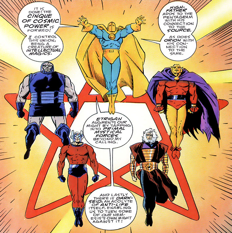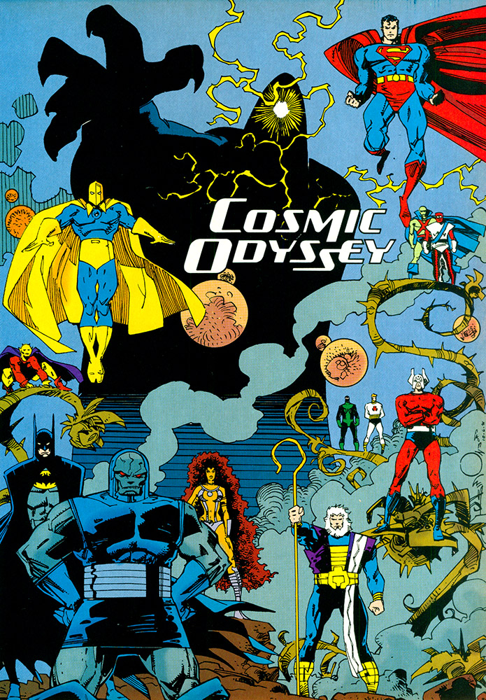 An alternate take on the origin of the New Gods. From Cosmic Odyssey #1 (1988); art by Mike Mignola and Carlos Garzon.The Anti-Life Entity. From Cosmic Odyssey #1 (1988); art by Mignola and Garzon. John Stewart fails to save the doomsday bomb from destroying Xanshi. From Cosmic Odyssey #2 (1988); art Mignola and Garzon.Doctor Fate channels five elemental powers. From Cosmic Odyssey #4 (1989); art by Mignola and Garzon.From Who's Who in the DC Universe #16 (1991); art by Walter Simonson.