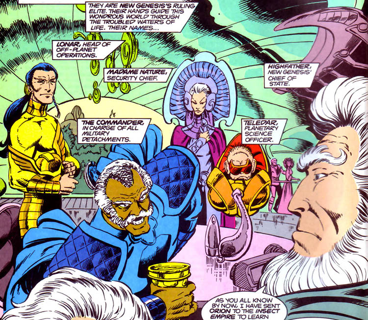 With issue #2, Jim Starlin's story picked up from this (and from Odyssey) with Orion presenting Forager's corpse to the Prime One (II) and the All-Widow. He stayed for the funeral and met the new Forager (II), a female of the Insect race. Orion had always been told that the Insect race was created by Darkseid to plunder his enemy's food supplies. Orion's friend, Akarl (the brother of Lightray [revealed #9]) and his parents were killed by the Insects in retaliation for Highfather's use of insecticides. Orion's visit changed his feelings towards the Insects and he became determined to broker peace between them and the gods. (#2) Orion escorted Insect leaders to Supertown in the midst of a meeting of the Council of Five, New Genesis' ruling Elite: Highfather, Lonar, Madam Nature (security chief), Teledar (planetary science officer), and the Commander (military chief). The Commander opposed any deal. To settle the matter, the Prime One proposed a duel between Lonar and Forager. Her speed and agility was impressive but Lonar was poised to kill her, and stopped. Metron stepped in to reveal the secret about the Insects: during the wars, New Genesis had created its own mutant monsters, a hybrid god-insect, but its kind escaped. Highfather's agreed that it was time to draft a treaty. (#3)