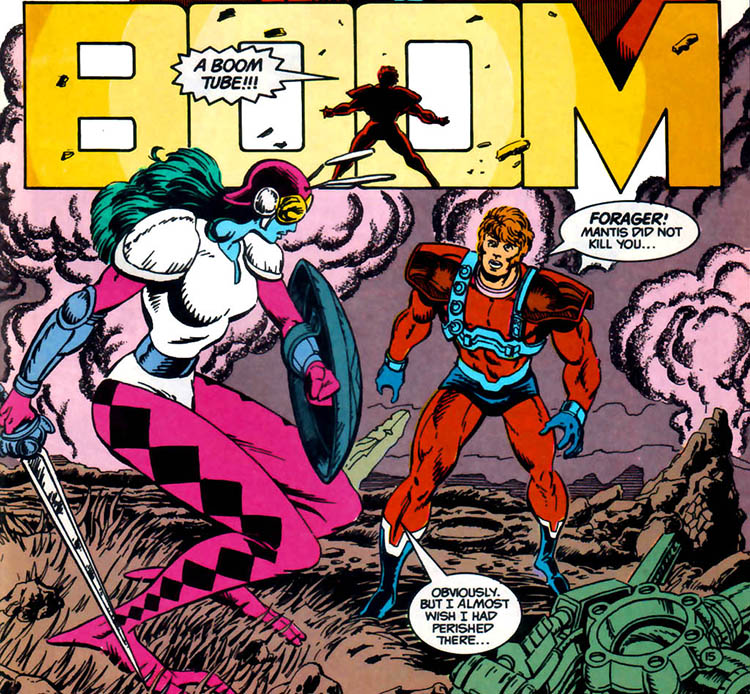 Peace was doomed when a rebel group of Insects allied with Mantis of Apokolips. They built a nuclear missile silo on Earth, drawing Orion and Forager in to battle. (#4) Mantis' nuclear missiles were launched but Orion diverted them via Boom Tube — back at the Insects on New Genesis. Though he had just campaigned for peace, his rage was quickly directed back at the Insect rebels who helped Mantis. Forager wailed in despair; more than rebels, the bombs had destroyed the entire Insect Empire. (#5)