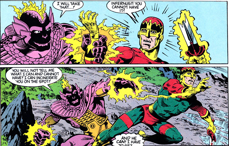 Metron and Fastbak discovered an ancient sword among the ruins of the Old Gods, and Darkseid sensed its power as well. They were forced send it to Earth where it transformed TV personality John Hedley into an Old God. Highfather reclaimed the sword while Orion fought Infernus. (#16)