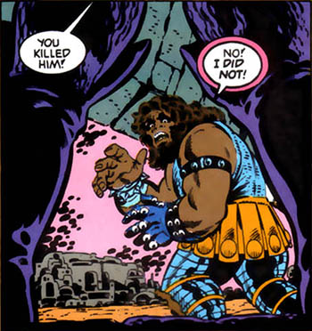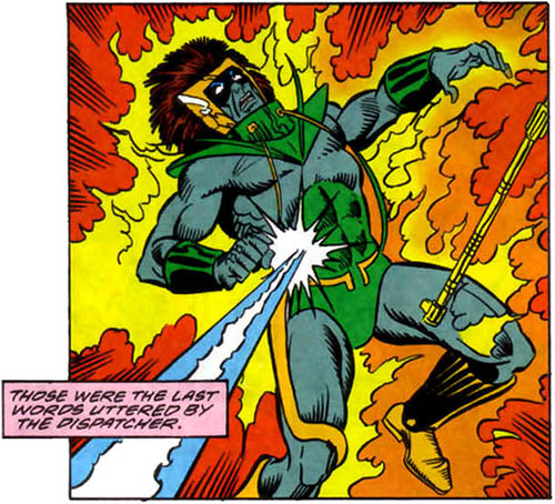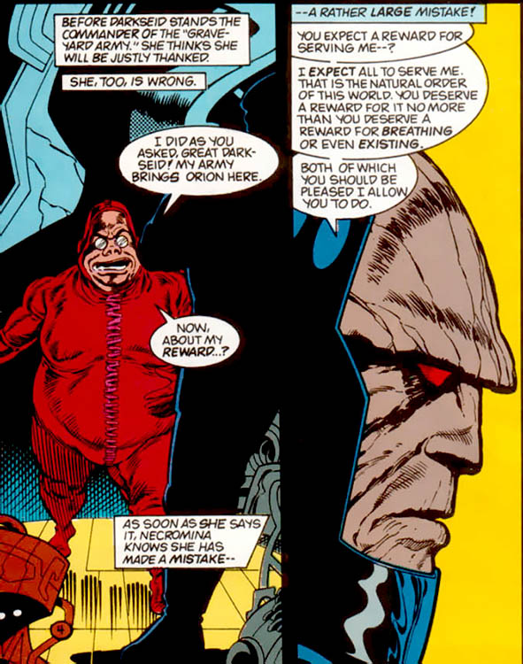 Infernus strikes Fastbak. From New Gods v.3 #16 (1990); art by Rick Hoberg and Will Blyberg. Hideous Necromina seeks her reward. From New Gods v.3 #19 (1990); art by Rick Hoberg and Will Blyberg. Brutish Agogg nears his end. From New Gods v.3 #23 (1991); art by Steve Erwin and Will Blyberg. Feckless Dispatcher, finished off by Darkseid. From New Gods v.3 #28 (1991); art by Rick Hoberg.