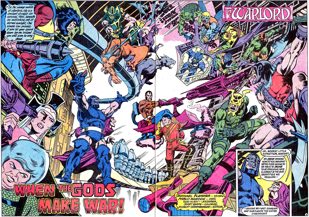Pinup-type page by John Byrne. From Superman v.2 #3 (1987). Superman falls under the spell of Amazing Grace. From Adventures of Superman #426 (1987); art by Jerry Ordway.Skartaris becomes a battleground for Darkseid and Highfather. From Warlord Annual #6 (1987); art by Pablo Marcos.