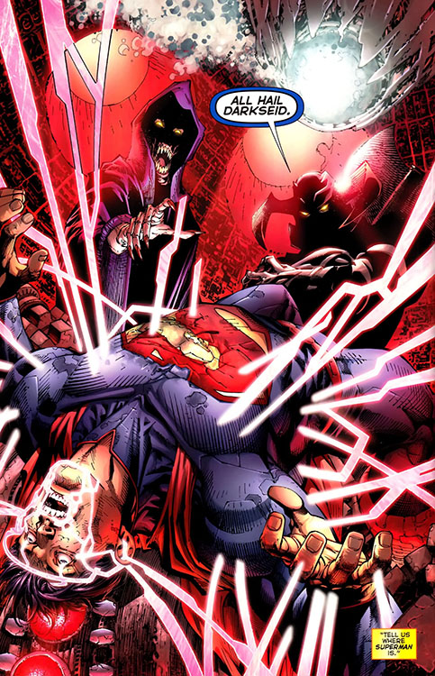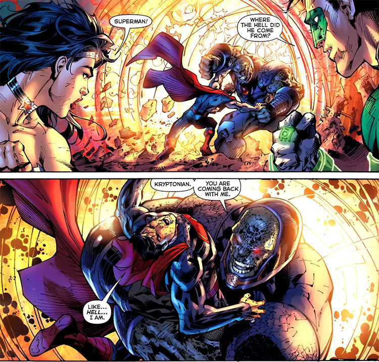 Superman falls to Desaad and Steppenwolf. From Justice League #1 (2011); art by Jim Lee and Scott Williams.Superman battles Darkseid back to Apokolips. From Justice League #1 (2011); art by Jim Lee and Scott Williams.