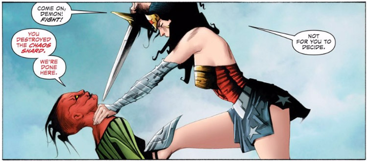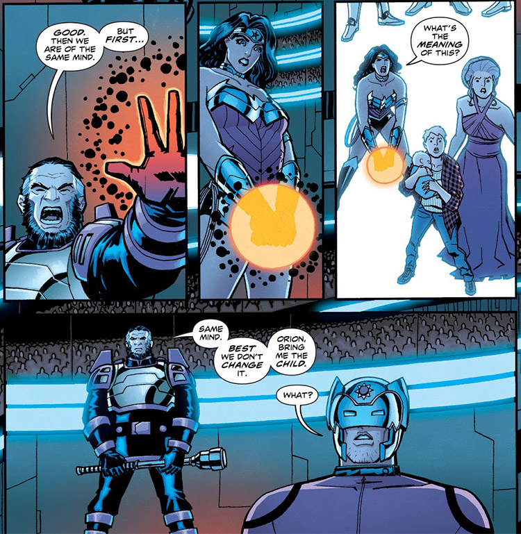 Just as Highfather was about to send them home, he bound Wonder Woman and ordered Orion to take the child. Orion defied the order and escorted his new friends back to Earth instead. Highfather simply wished him luck. (#22)Note: Highfather was shown first in shadow, in Wonder Woman v.4 #14 (Jan. 2013), and fully revealed in #21.
