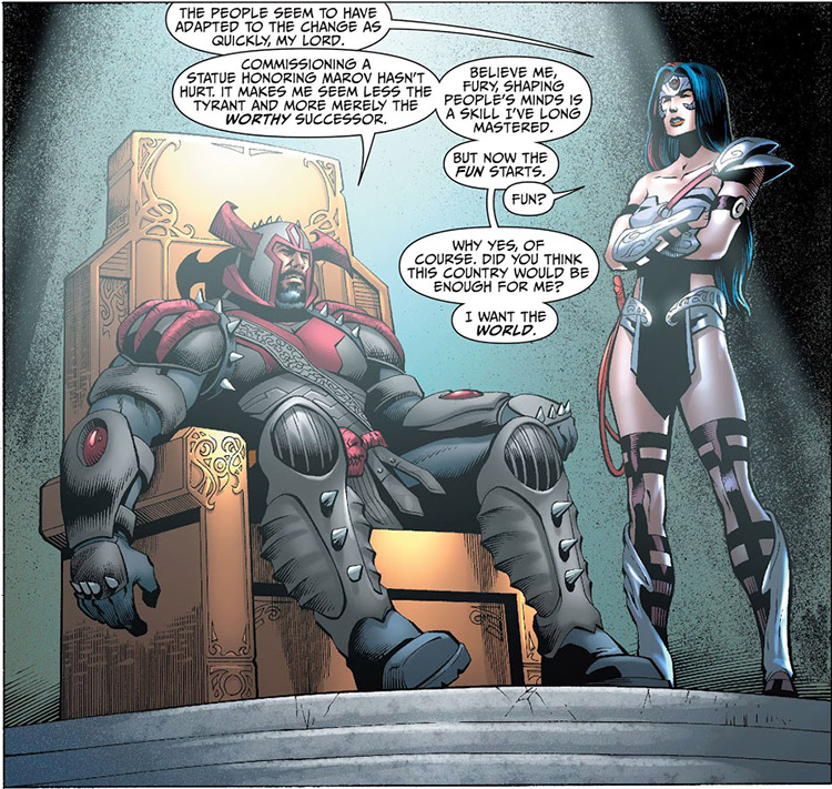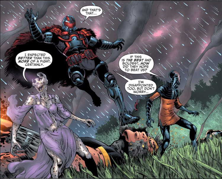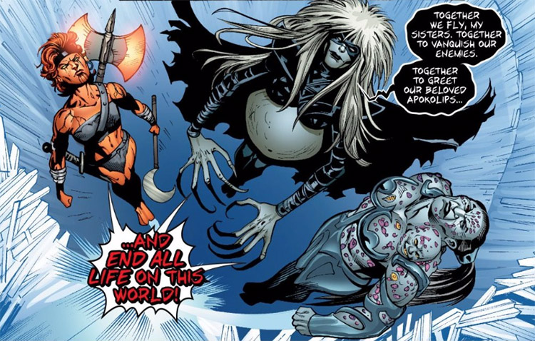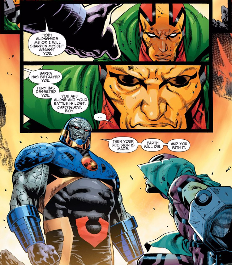 Furies: War, Death, and Pestilence. From Earth 2: World's End #7 (2015); art by Jan Duursema and Keith Champagne.The Court of Apokolips: Arcanis, Paternus, Lowest, and Rectifier. From Earth 2: World's End #11 (2015); art by .Darkseid turns the tables on his adopted son. From Earth 2: World's End #11 (2015); art by Paolo Siqueira and Cam Smith.