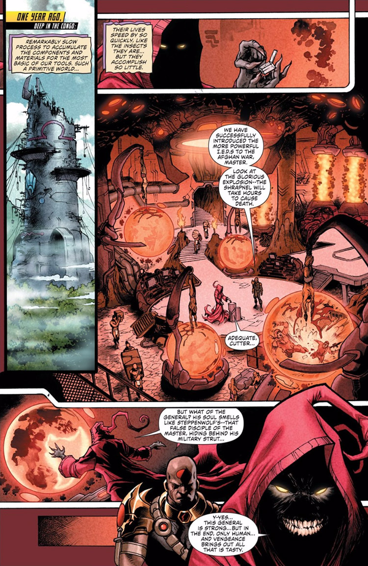 Elsewhere the demons engaged Wonder Woman and Steve Trevor, while more portals opened. At S.T.A.R., Silas Stone saved his son by bonding him with Promethium; Victor became Cyborg, a conduit for digital information; he saw visions of Darkseid and heard a pinging sound. (#3) Cyborg also learned that Parademons were created with harvested organic materials that were reprocessed in the service of Darkseid. Victor assimilated the Mother Box's teleportational technology and transported all the heroes together to meet lord Darkseid when he arrived on Earth. (#4)