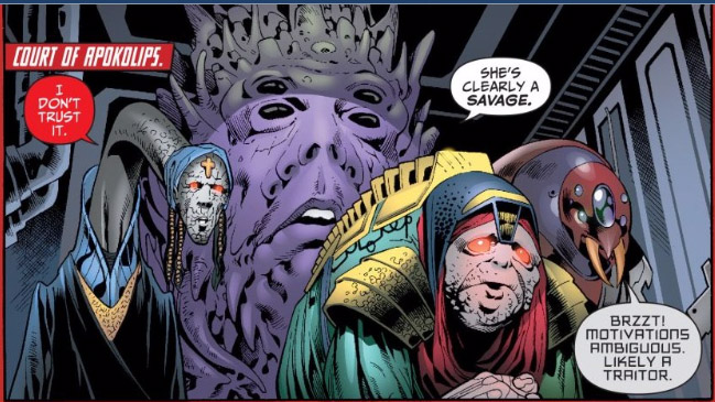 As the burning planet approached, the Court of Apokolips was called together. Presiding over the Court was an entity named Apokolips that was described as its "talking throne." The nobles convened: giant Paternus, the insectoid Rectifier, diminutive Lowest, and gangly Arcanis. They were distressed, as Darkseid had retreated into a Mobius Chamber some time before. His aim was to recover (presumably from his fight with the Justice League) and empower himself by consuming the very heart of Apokolips. (Earth 2: Worlds' End #2, 4)