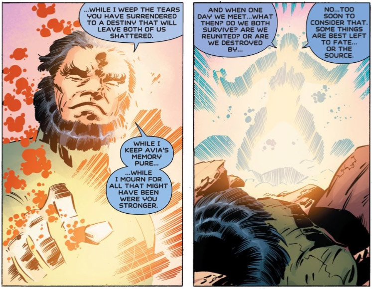 At this point Darkseid had proposed the pact to exchange their sons. Izaya had not yet agreed and was in search of wisdom. His friend, Himon, used his powers to transport them to the Source Wall. They witnessed the motionless Promethean Giantsand found the Source shard, the only remaining piece of the original Wall. The Source ordered him to accept the pact, and it transformed him. Its power infused Izaya and cleaved him into two beings — Highfather and the Infinity Man. The Infinity Man held the peaceful essence of Izaya while Highfather became ever more warlike. (#9)