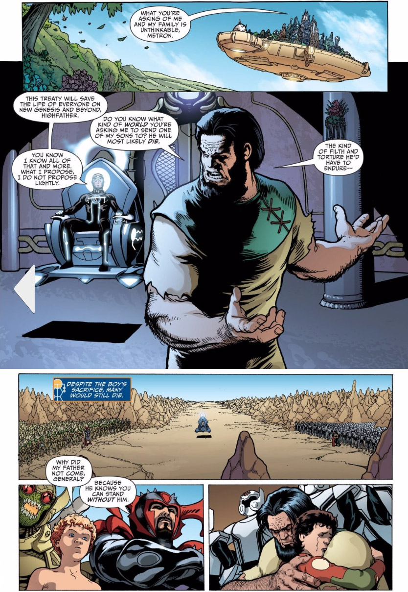 When the First Born finally came into conflict with Wonder Woman's group, Orion snatched them away from the battlefield by opening a Boom Tube back to New Genesis. (#21) Highfather offered them hospitality and healed their wounds. They learned that he had ruled for millennia, and that New Genesis was a golden island that orbited a green planet. No structures were allowed on the surface; it was kept as a monument to a great war that had poisoned the planet. That war ended in stalemate.