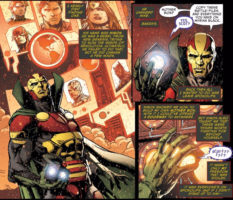 Eventually some of Highfather's own Council began to doubt his plans. (Green Lantern Corps #37) Metron aided Kyle Rayner and Carol Ferris, giving them a Mother Box. (Green Lantern: New Guardians #37)