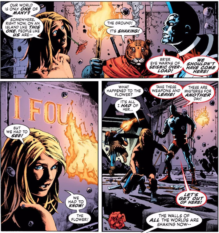 The Unifriend (the Fourth World's flaming-hand-of-god) writes "I Found you" on the wall. This is the action of Nix Uotan, the last of the multiversal Monitors. The new New Gods only watch; they are not yet powerful enough to intervene.