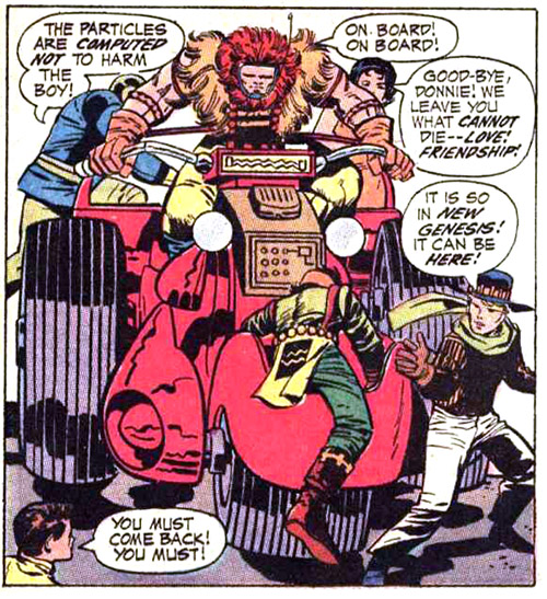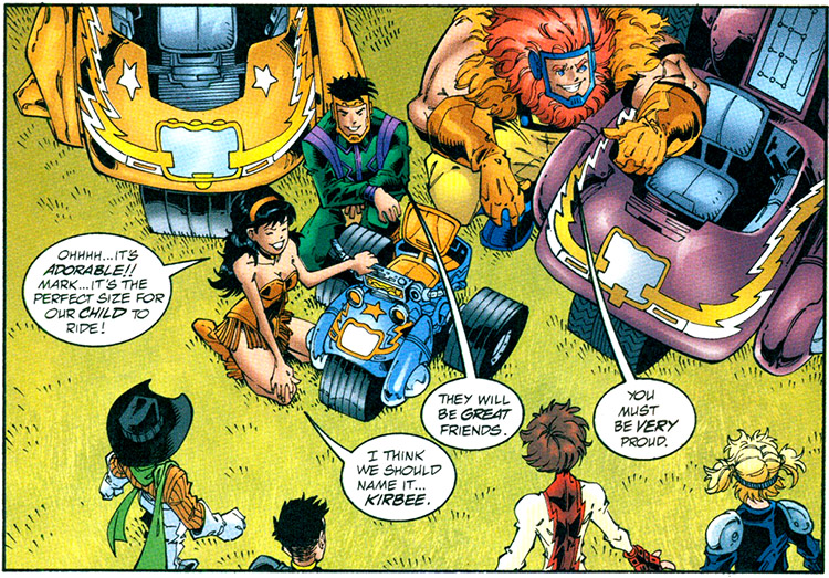On New Genesis, Mark and Dreamer frolicked in a field when their Super-Cycle went into lockdown and began attacking them. On Earth a similar scene unfolded for Young Justice, their Cycle going berserk and prompting them to open a Boom Tube to New Genesis. The teens met the Forever People, who said the second Cycle was stolen from them by Rip Roar years earlier. (#28) Dreamer tried to soothe the Cycles but they merged to form a giant stomping robot. The Infinity Man was summoned but this time the hero Impulse joined them and became a part of the fusion. This version of the Infinity Man was unstable and they were soon separated. Following more commotion the vehicles produced a sort of "offspring," a small three-wheeler that Dreamer named "Kirbee." (#29) Note: This was the first story to retcon away Big Bear's and Dreamer's relationship, though at the end of the story, she said the new vehicle was "the perfect size for our child to ride!"